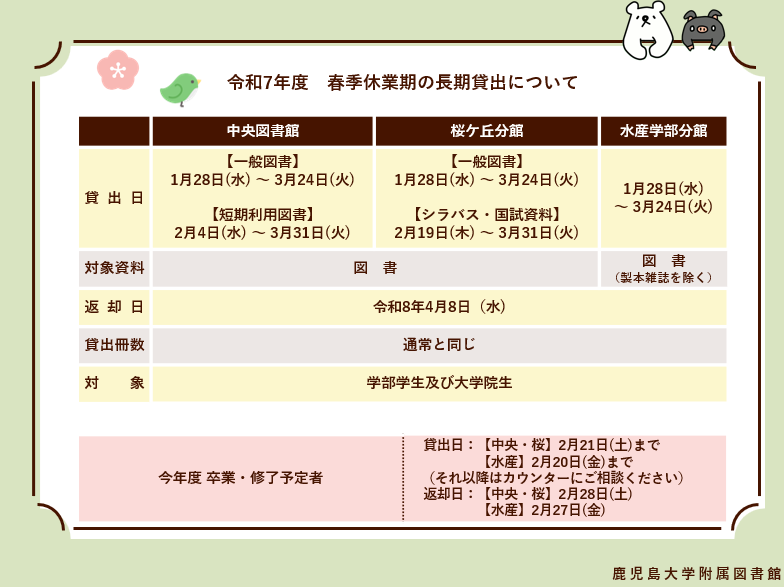 ※ただし、今年度卒業・修了予定者については、返却日は中央図書館及び桜ケ丘分館が2月28日(土)、水産学部分館が2月27日(金)となりますのでご注意ください。