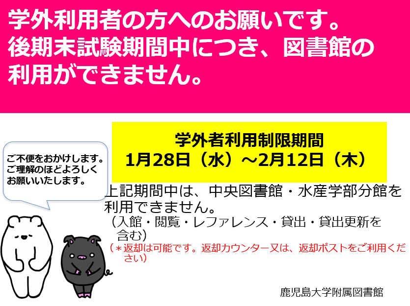 試験期間中は、本学の学生の利用を優先するため、一般(学外)利用者の利用を制限させていただきます。