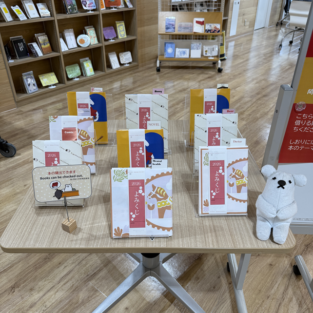 桜ヶ丘分館1階エントランスホールにておみくじ付きの図書を展示しています。